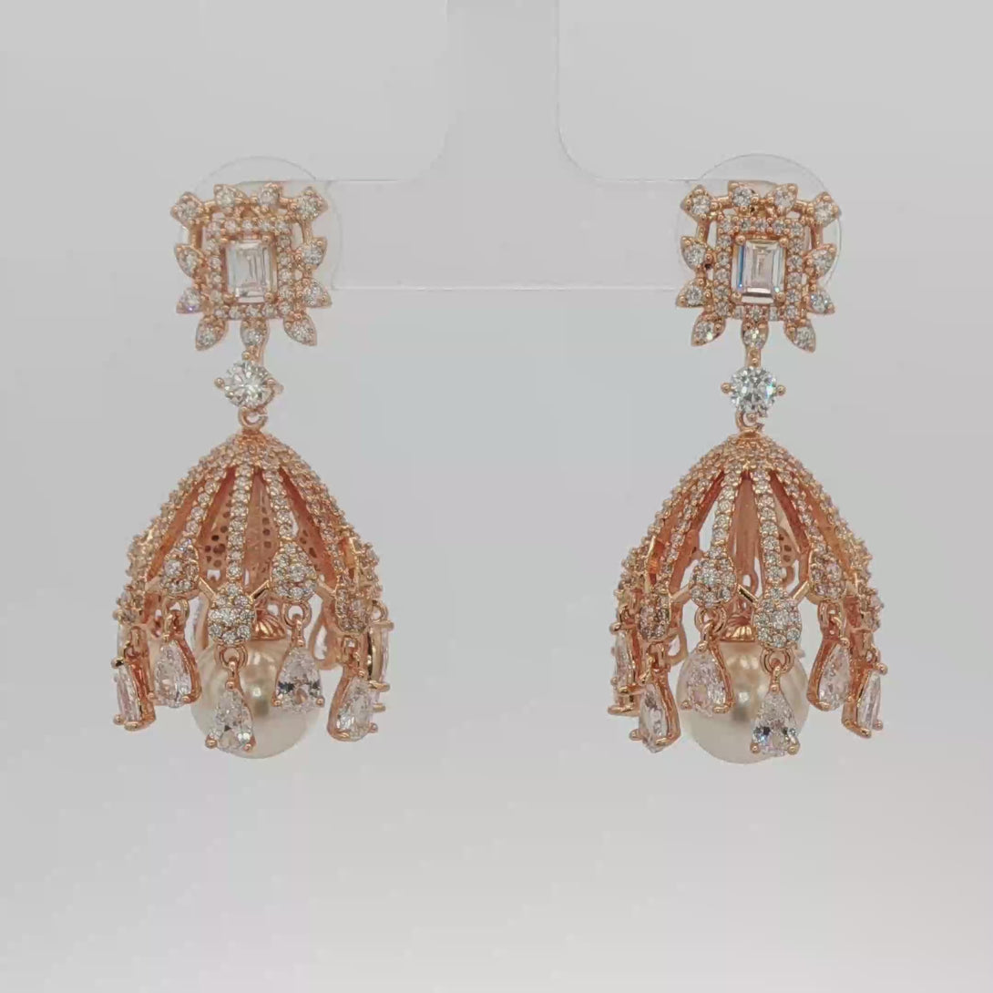 Exquisite Rose Gold Geometric Diamond Jhumkas with Pear-Drop Accents